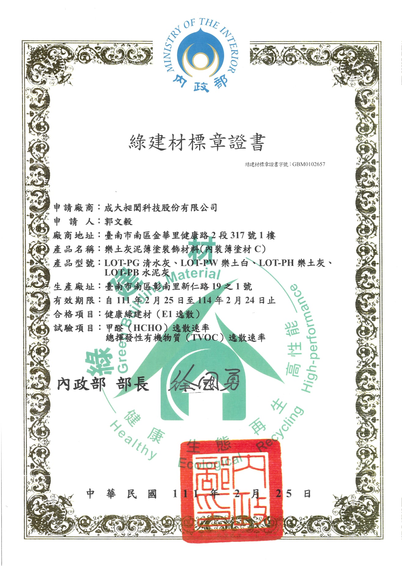 〈標章種類〉:健康綠建材標章 〈標章編號〉:GBM0102657 〈標章效期〉:111/ 02/ 25 ~114/ 02/ 24